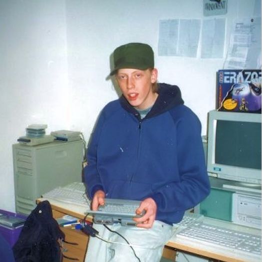 Tom Hürlimann im Serverzimmer mit dem ersten Webserver (links)